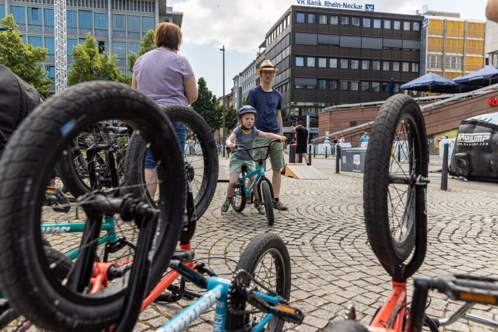 Jump it! Auf unseren mobilen Rampensetups kann sich jedermann, auch ohne eigenes Rad, selbst ausprobieren. Mithilfe unserer Leihräder und Coaches sorgen wir dafür, dass du auch sicher landest.